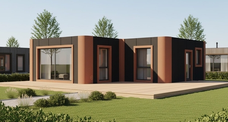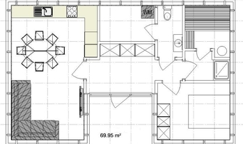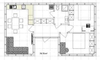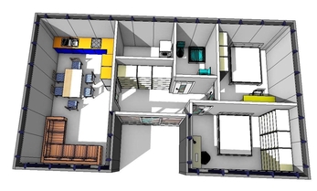Вот несколько перспективных проектов нанодомов, которые будут сочетать в себе практичность, комфорт, энергоэффективность, надежность, современную архитектуру и дизайн. Например, один из вариантов — это дом общей площадью 76.7 квадратных метров, включающий в себя просторную кухню-гостиную, две спальни, холл, большой санузел и техническое помещение под котельную, прачечную и т.д. Высота потолков 3 м.